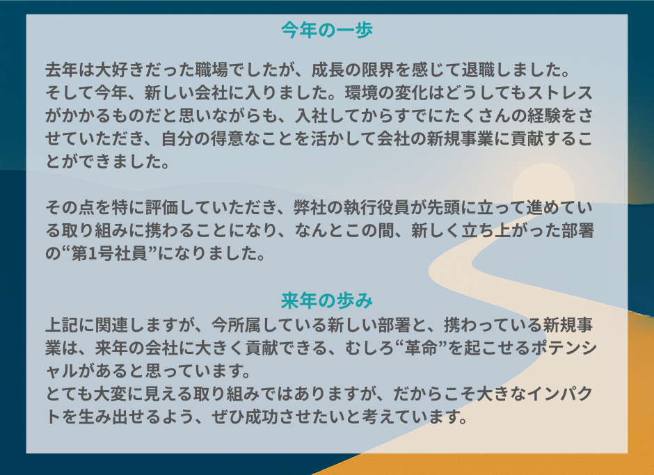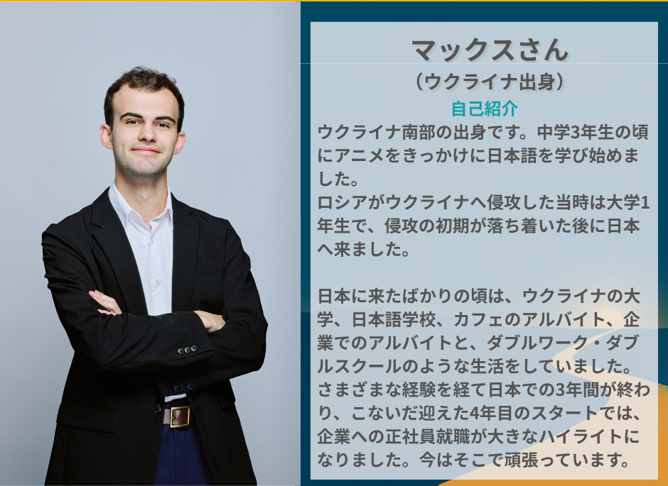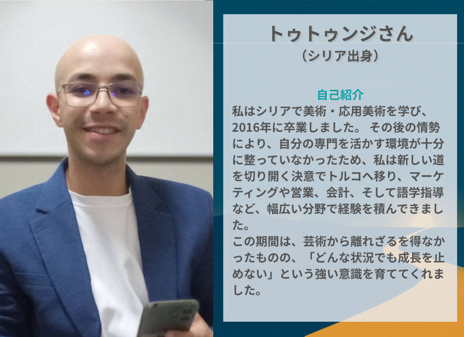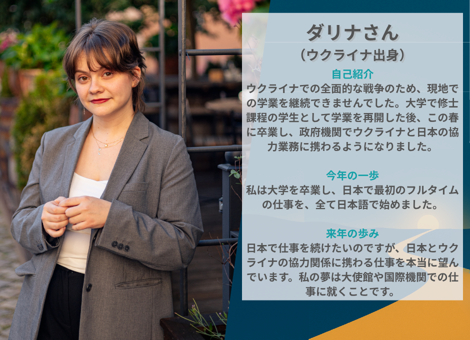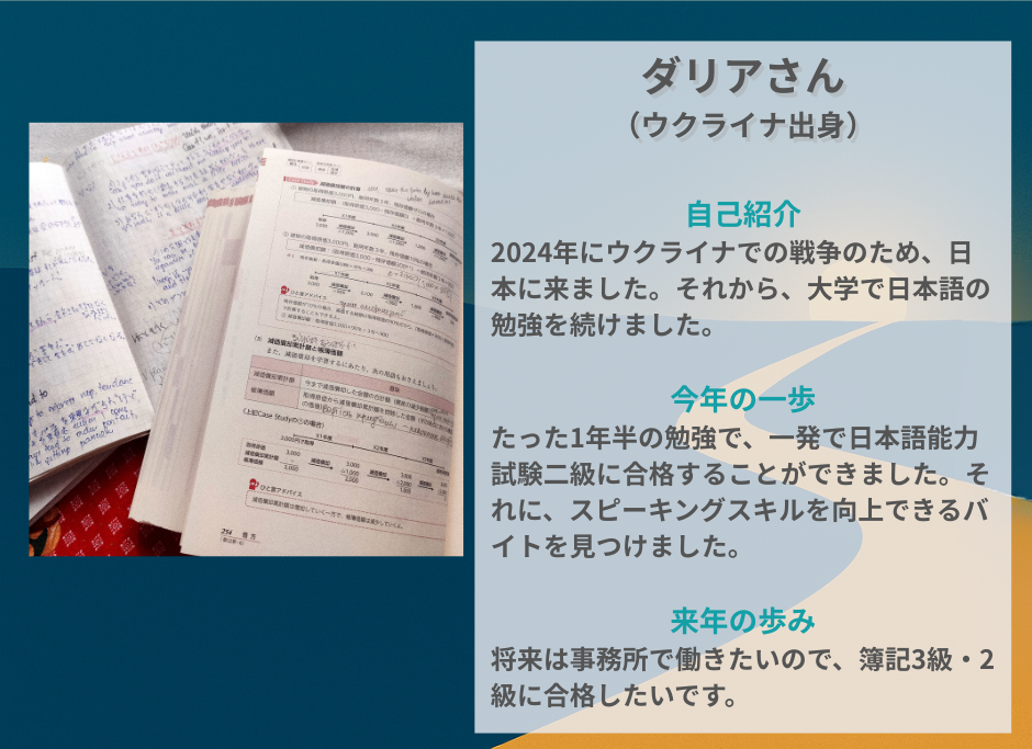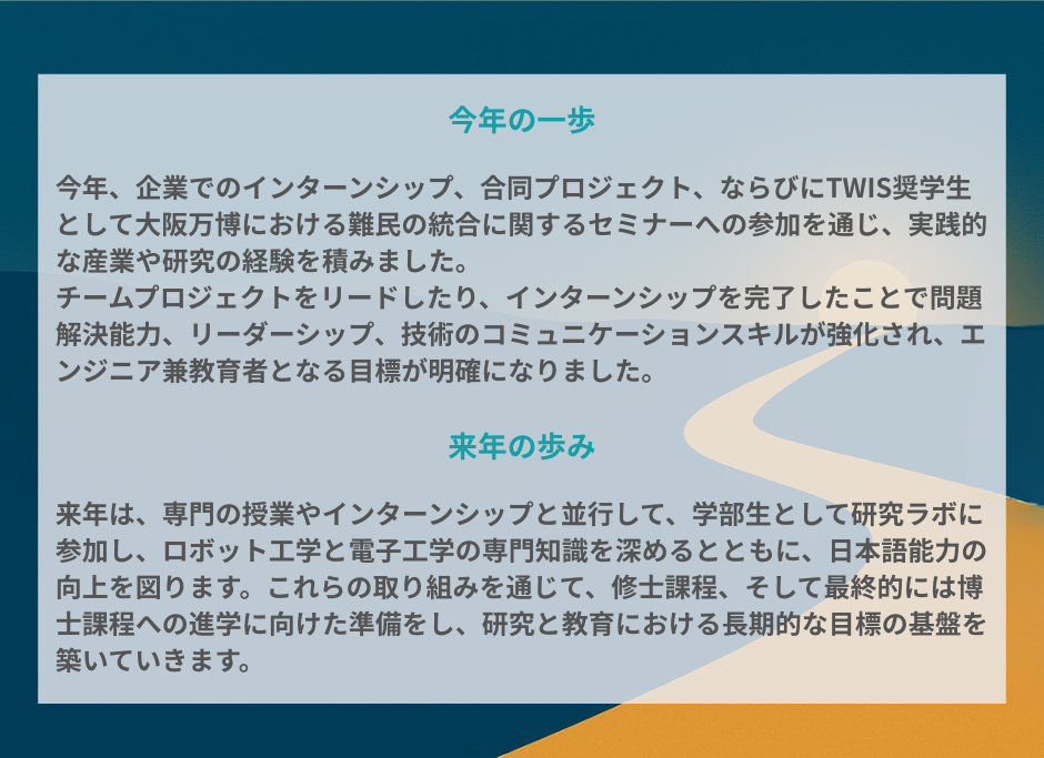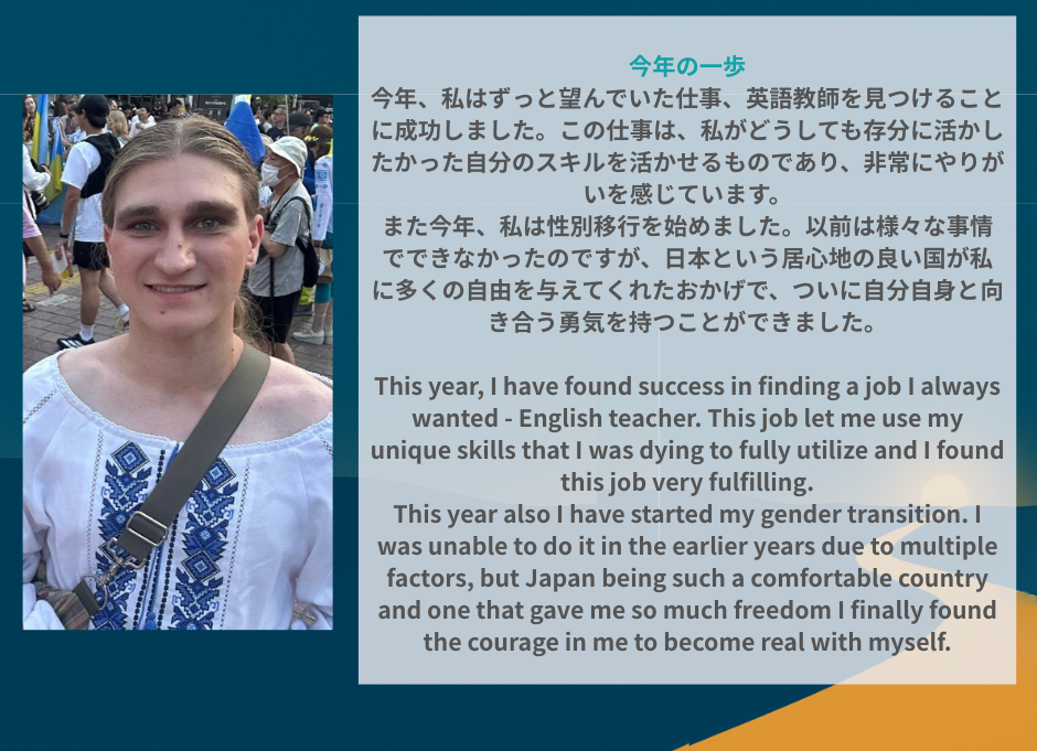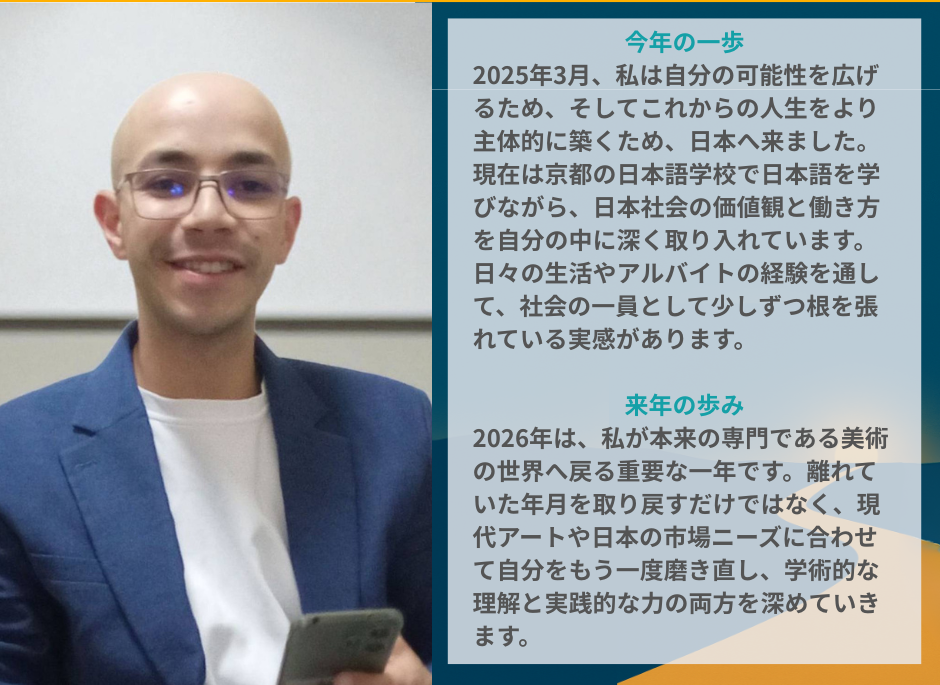 「日本で新たな生活を始めることは、私にとって大きな節目となるものでした。初めて到着した時は、すべてが新鮮でワクワクするものでした。日本の生活に適応するのは簡単ではありませんでしたが、それぞれの困難を通して多くのことを学び、次第に強くなっていきました。