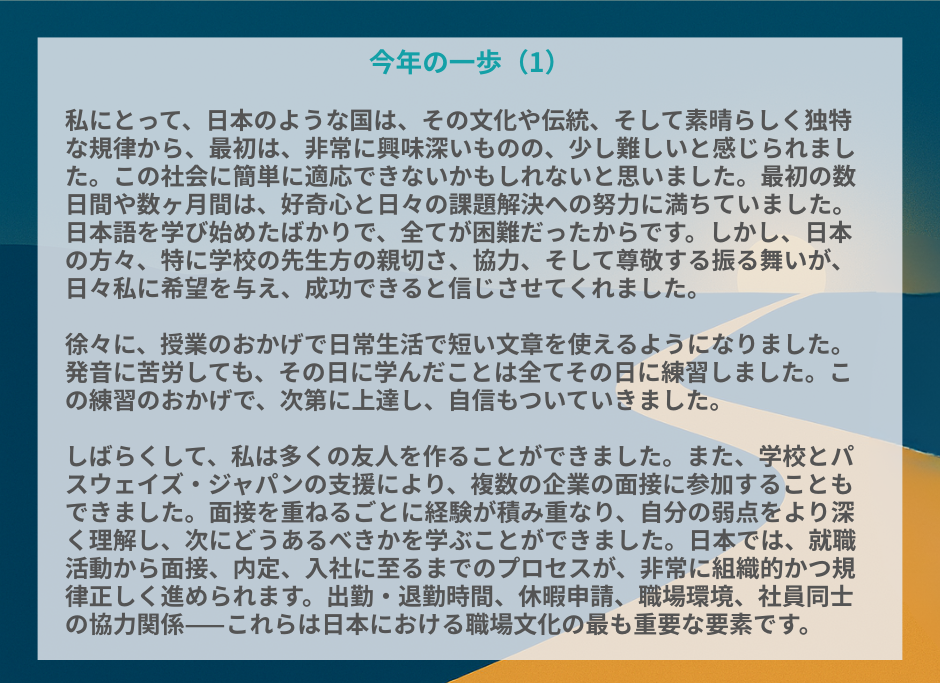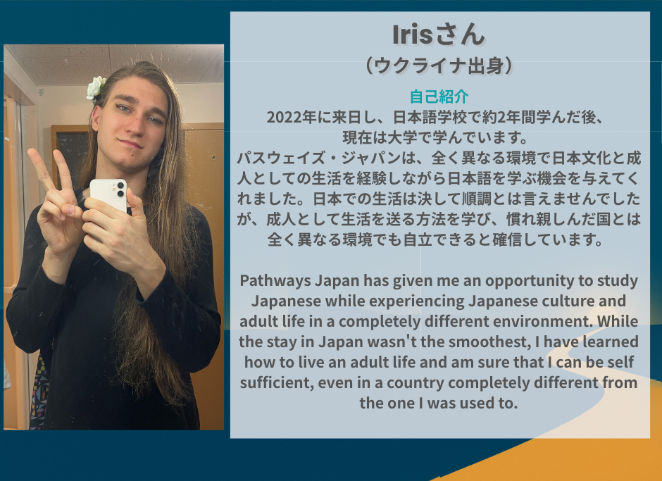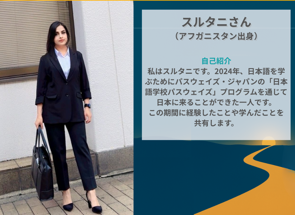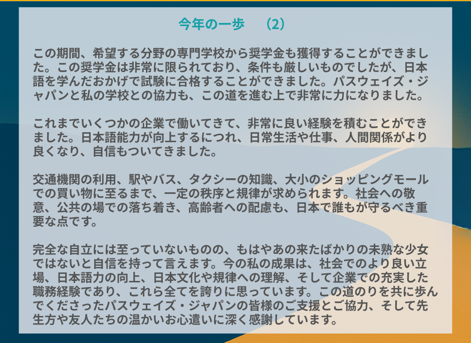 パスウェイズ・ジャパンの支援により、私は人生の新たな章を始める機会を得ました。学び、成長し、未来を再構築するチャンスです。この機会は、私の希望とモチベーションを回復させてくれた奇跡のように感じられました。