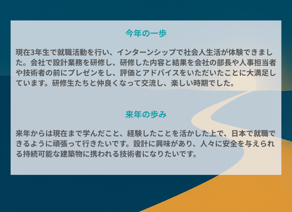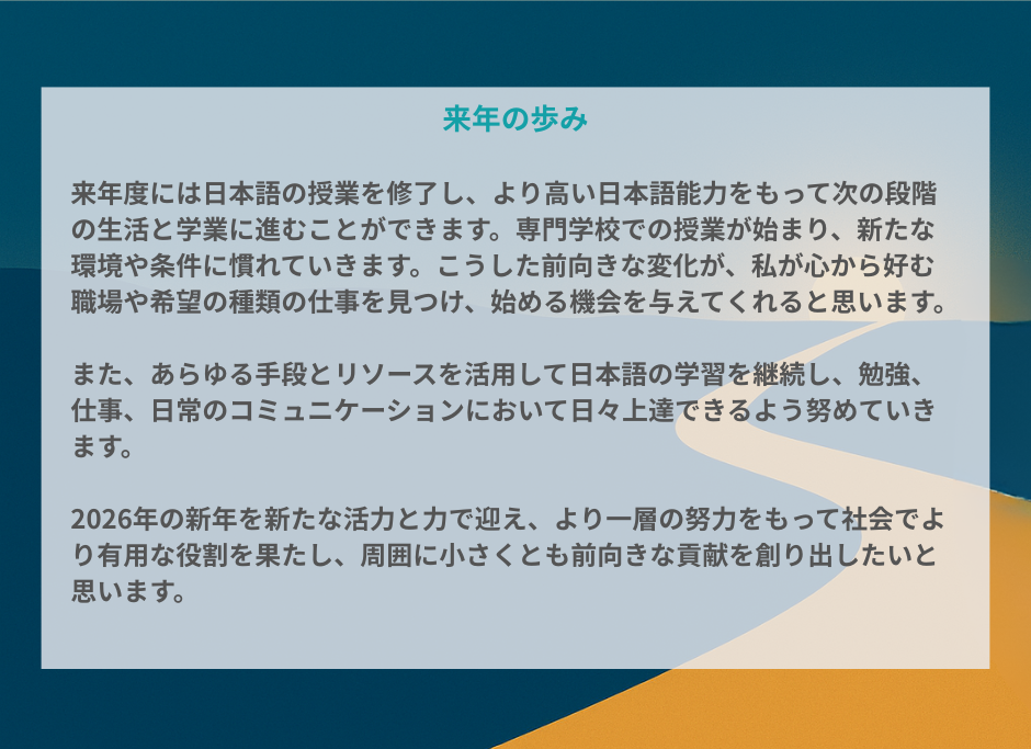 将来は日本の大学に進学し、ビジネスを学びたいと考えています。私の夢は、国と国をつなぎ、人とアイデアを結びつけ、世界に良い影響を与える機会を創出する起業家になることです。輝かしい未来を築くために、これからも努力を続けていきます。」