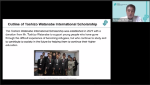 難民の背景を持つ人々の高等教育進学率は、2022年現在、全世界で6%と、一般の若者に比べて著しく低くなっており、SDGsの枠組みの中、2030年までに15%を達成するため、各国で取り組みが進められています。渡邉利三国際奨学金は、難民となる困難な経験を経ても学びを続け、将来社会に貢献しようと努力する若者達の大学進学支援を目的に、渡邉利三氏の寄付により2021年に設立されました。従来日本で奨学金応募の機会が限られていた期間限定の在留資格 の方々を対象にしており、学費と生活費を支援する返済不要のフルスカラーシップ ( 金額の上限あり ) を提供することで、難民の若者自身が 選択する様々な専門分野で、短大から大学学部、大学院まで各レベル の教育機関への進学が可能となります。