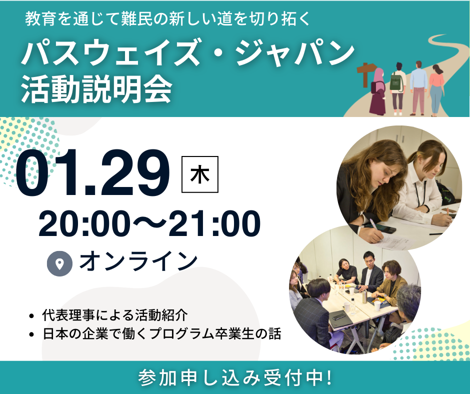 パスウェイズ・ジャパンが行う難民受け入れ「教育パスウェイズ」の取り組みと日本で学ぶ難民・避難民の若者について知っていただくため、どなたでもご参加いただけるオンラインイベントを開催します。