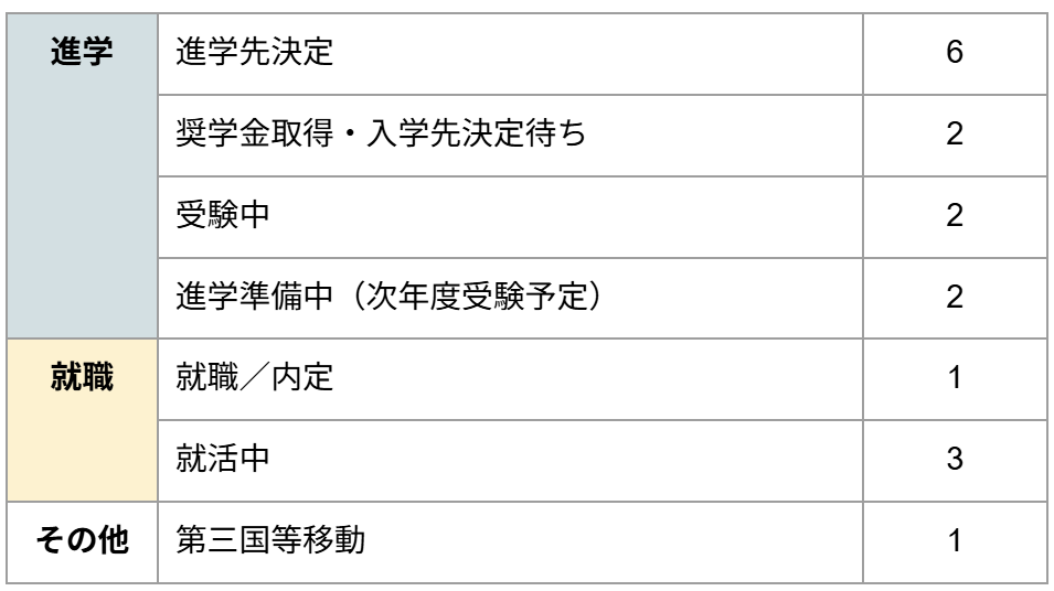 現時点の進路は以下の通りです。進学希望者のうち約7割が進路を決定、奨学金を取得することができました。