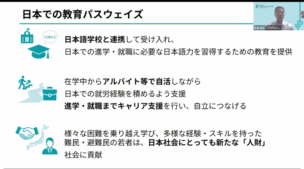 当日は、まず、代表理事の折居から、教育を通じた受け入れとパスウェイズ・ジャパンの教育を通じた受け入れのモデルと活動について紹介しました。